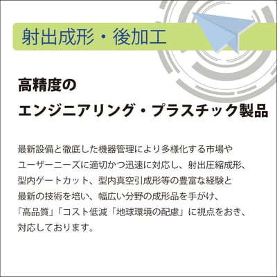 特に寸法精度が厳しく要求される成形品「エンジニアリング・プラスチック製品」の生産に力を注ぎ、高精度・多様化するユーザーニーズにお応えしています。